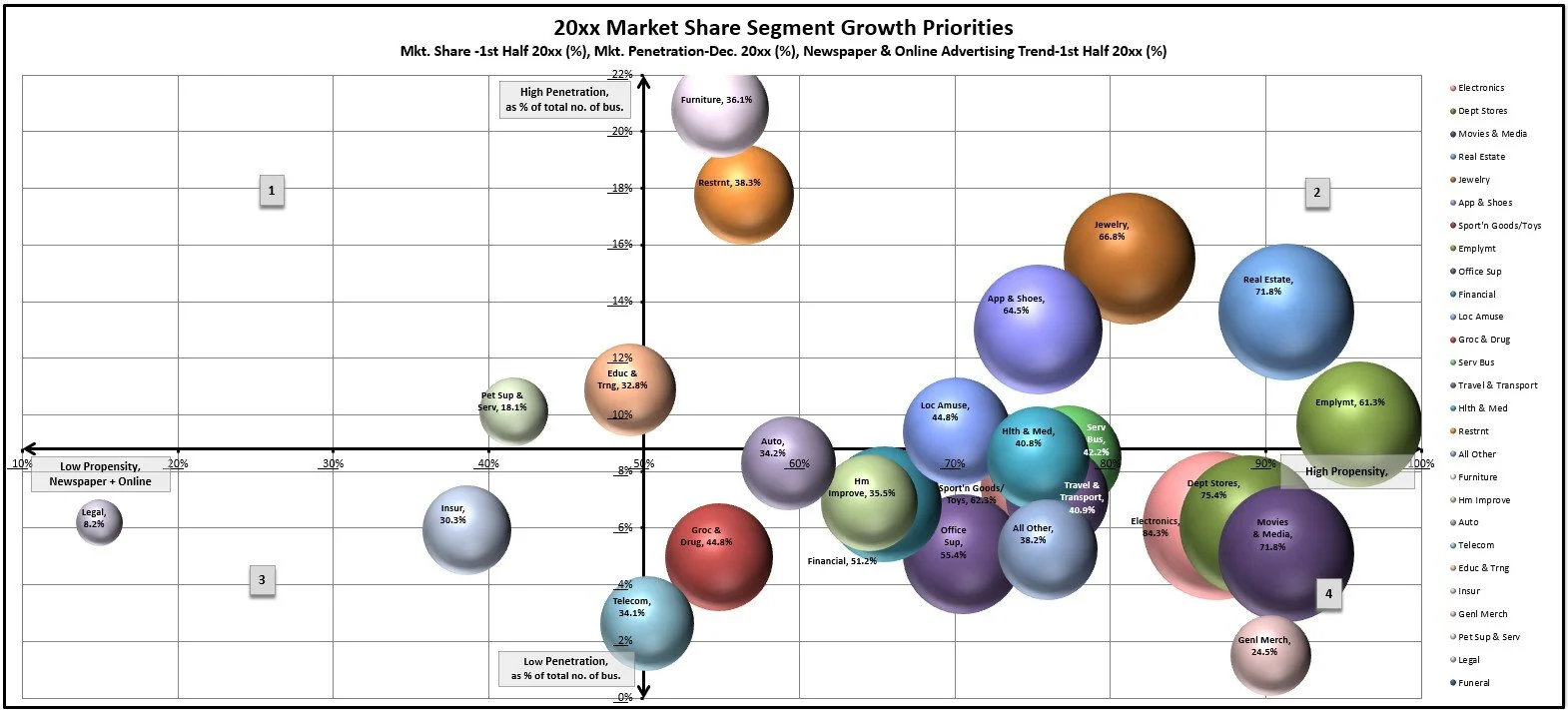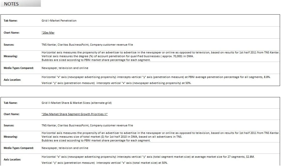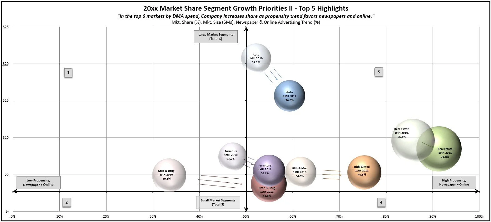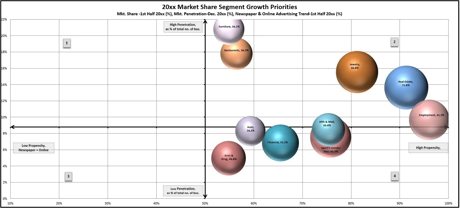 I built a segmentation grid using bubble charts to map revenue, penetration, and growth potential. The framework guided annual sales strategy and marketing campaigns.